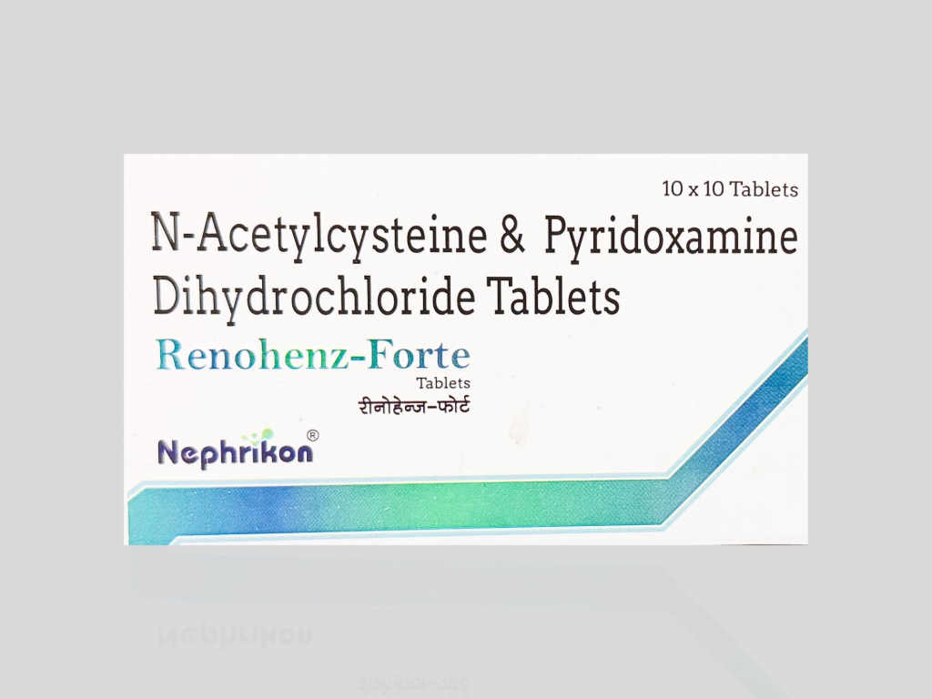 Renohenz tablet contain combination of N-Acetylecysteine & pyridoxine dihydrochloride ,used in the treatment of diabetic kidney disease. NAC scavenges free radicals, improves endothelial function, and reduces proteinuria and systemic inflammation & Pyridoxine reduces hyperhomocysteinemia and supports nerve health, helping prevent uremic neuropathy.Renohenz-Forte is being recommended as OD or BD.